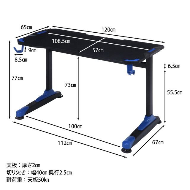 天板は24インチモニタを2台設置しても広々使える幅120cmです。天板にはケーブル流しがついており、配線もスッキリまとめられます。左右にはヘッドフォンフックが付いております。